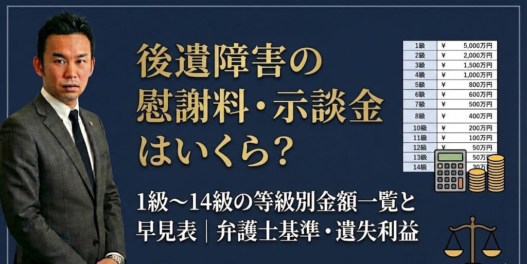 2018年2月 後遺障害の基礎知識 2018年02月24日 後遺障害の慰謝料・示談金はいくら?1級〜14級の等級別金額一覧と早見表│弁護士基準・遺失利益 交通事故でケガが治りきらず、症状が残ったときに争点になりやすいのが後遺障害の等級と、そこから決まる慰謝料や示談金です。 この記事では、後遺障害1級〜14級の金額相場を早見表で整理しつつ、示談金の内訳、弁護士基準と自賠責基準の差、そして示談金が大きく動きやすい逸失利益まで、実務目線でまとめます。 示談金の金額は、等級が決まった瞬間に半分決まると言っても過言ではありません。逆に言うと、等級が適正でないと、どれだけ交渉しても伸びにくいのが交通事故の賠償です。まずは認定の土台となる書類と証拠の整え方が重要です。 示談金は慰謝料だけではなく損害項目の合計で決まる 示談金は、後遺障害慰謝料だけの金額ではありません。実務では、次のような損害項目の合計が示談金になります。 治療関係費(治療費、通院交通費、付添費など) 休業損害(事故が原因で働けなかった損害) 入通院慰謝料(治療期間に対応する慰謝料) 後遺障害慰謝料(等級に応じた慰謝料) 逸失利益(後遺障害で将来の収入が減る損害) 将来介護費、装具費、家屋改造費など(重い等級で問題になりやすい) このうち、等級が絡むのは後遺障害慰謝料と逸失利益です。示談金の増減が大きくなりやすいのも、結局ここです。 慰謝料の計算基準は自賠責基準と弁護士基準で金額が大きく変わる 交通事故の慰謝料には、主に次の3つの基準があると言われます。 自賠責基準:自賠責保険の支払基準。最低限の救済としての基準 任意保険基準:各保険会社の内部基準。公表されていない 弁護士基準:裁判例の集積を踏まえた基準。最も高額になりやすい 実務で揉めるのは、任意保険が提示する金額が自賠責寄りになっているケースが少なくない一方、被害者側は弁護士基準を前提に考えたいからです。 この記事の早見表では、まず自賠責基準と弁護士基準を並べて差を可視化します。 後遺障害慰謝料の早見表:等級別の自賠責基準と弁護士基準 後遺障害慰謝料は、原則として認定された等級に応じて定型的に決まります。以下は後遺障害慰謝料だけの相場です。 等級自賠責基準の後遺障害慰謝料弁護士基準の後遺障害慰謝料差のイメージ1級1150万円2800万円大きい2級998万円2370万円大きい3級861万円1990万円大きい4級737万円1670万円大きい5級618万円1400万円大きい6級512万円1180万円大きい7級419万円1000万円大きい8級324万円830万円大きい9級245万円690万円大きい10級187万円550万円大きい11級135万円420万円中12級94万円290万円中13級57万円180万円中14級32万円110万円中 注意点として、介護を要する後遺障害(別表第一)の1級と2級は、慰謝料の枠が別に設けられています。自賠責では1級が1650万円、2級が1203万円とされ、初期費用が加算される仕組みもあります。 自賠責の後遺障害保険金は等級ごとに上限が決まっている 自賠責保険は、後遺障害による損害について等級別に支払上限(保険金額)が定まっています。示談交渉では任意保険が上乗せすることが多い一方、自賠責の枠を理解しておくと、見通しが立てやすくなります。 等級自賠責の支払上限(後遺障害による損害)補足1級3000万円別表第二2級2590万円別表第二3級2219万円4級1889万円5級1574万円6級1296万円7級1051万円8級819万円9級616万円10級461万円11級331万円12級224万円13級139万円14級75万円 上の金額には、後遺障害慰謝料だけでなく、逸失利益なども含めた枠として扱われます。つまり、後遺障害慰謝料がそのまま上限ではない点が重要です。 示談金の中で差が大きくなりやすいのは逸失利益 後遺障害が残ると、仕事の能率が落ちたり、配置転換で収入が下がったり、退職や転職を余儀なくされることがあります。これを将来にわたる減収として評価するのが逸失利益です。 逸失利益は、同じ等級でも年齢、職業、収入、働き方、症状の影響の出方で大きく変わります。示談金の総額が伸びるかどうかは、ここで勝負が決まることが多いです。 逸失利益の基本式は基礎収入と喪失率と期間で組み立てる 実務でよく使われる考え方は次のとおりです。 逸失利益 = 基礎収入 × 労働能力喪失率 × 労働能力喪失期間に対応する係数 係数には中間利息控除などの考え方が入り、裁判実務ではライプニッツ係数などが使われます。ここでは概念の理解を優先し、まず喪失率を早見表で整理します。 労働能力喪失率の早見表:等級ごとの目安 労働能力喪失率は、等級ごとに目安が置かれており、逸失利益の計算の起点になります。 等級労働能力喪失率の目安1級100%2級100%3級100%4級92%5級79%6級67%7級56%8級45%9級35%10級27%11級20%12級14%13級9%14級5% ただし、実際の裁判や示談では、症状固定後の回復見込み、職種との相性、就労実態などにより、喪失率や喪失期間が争点になります。単純に表どおりにならないことがある点が重要です。 認定率というより、どの等級帯に認定が集まりやすいかを押さえ